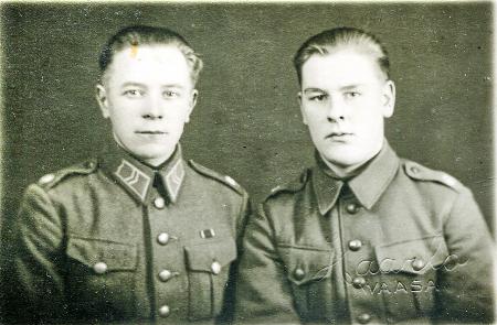 Fotoateljé fotografi av Otto Martin och John Thölix i militäruniform.