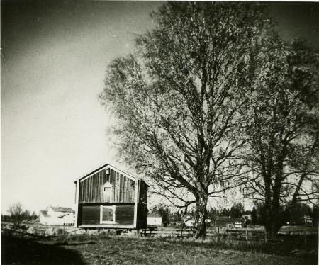 Fotografi av den gamla sädesboden och de ståtliga björkarna vid "Påvis". I bakgrunden till vänster butiksbyggnaden och till höger Emil Rodas egnahem (delvis skymd) jämte ribyggnaden-garaget.