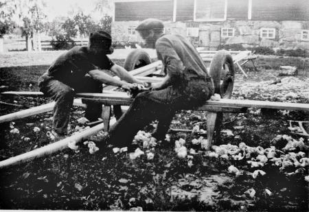 Med stenfähuset i bakgrunden sitter Evald Vesterlund till höger och drängen Erling arbetande med en ny "laangflaka"