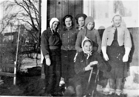 Från vänster, Linnéa Uppgård, Greta Ahlbäck, Etel Uppgård, Margit Boij, Estrid Rodas. Sittande på sparken Ella Enegren. Av systrarna Uppgård gifte sej Linnéa till Kaitsor och fick namnet Heikius, Etel gifte sej med Fride Smeds i Solv. Margit Boij gifte sej med Ernst Sjöblom och flyttade till Sverige. Ella blev fru Smulter i Helsingby