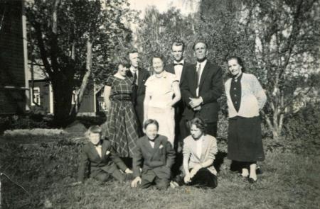 Från vänster Mabel och Börje Köping, Siri, Kjell-Erik konfirmand, Runar och Ida Backman, Sittande småsyskonen, Roland, Tage och Gunnevi.