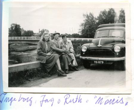 Ingeborg Martin, Jalle och Rut Martin på biltur med Jalles Morris Minor.