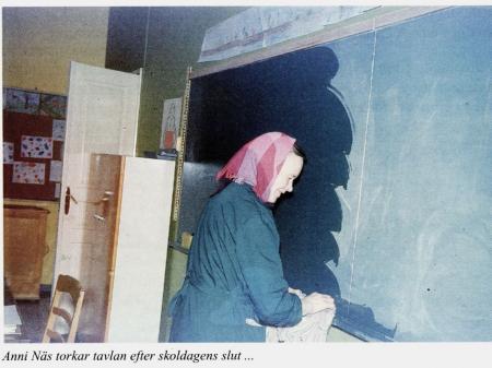 Anni Näs, kokerska och städerska i Tölby-Vikby skola under många år. Här fotograferad under arbete med att rengöra tavlan.
