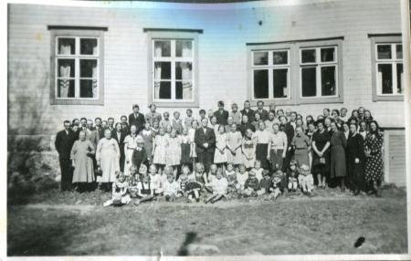 Okänt när fotot är taget, tölbybor unga och samlade samlade vi skolbyggnadens södra gavel.