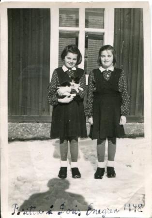 Tillvänster Britta hållande sin kissemiss och Doris. Britta emingredae till Sverige i unga år, Doris blev jordbrukarhustru. Födelseår 1937.